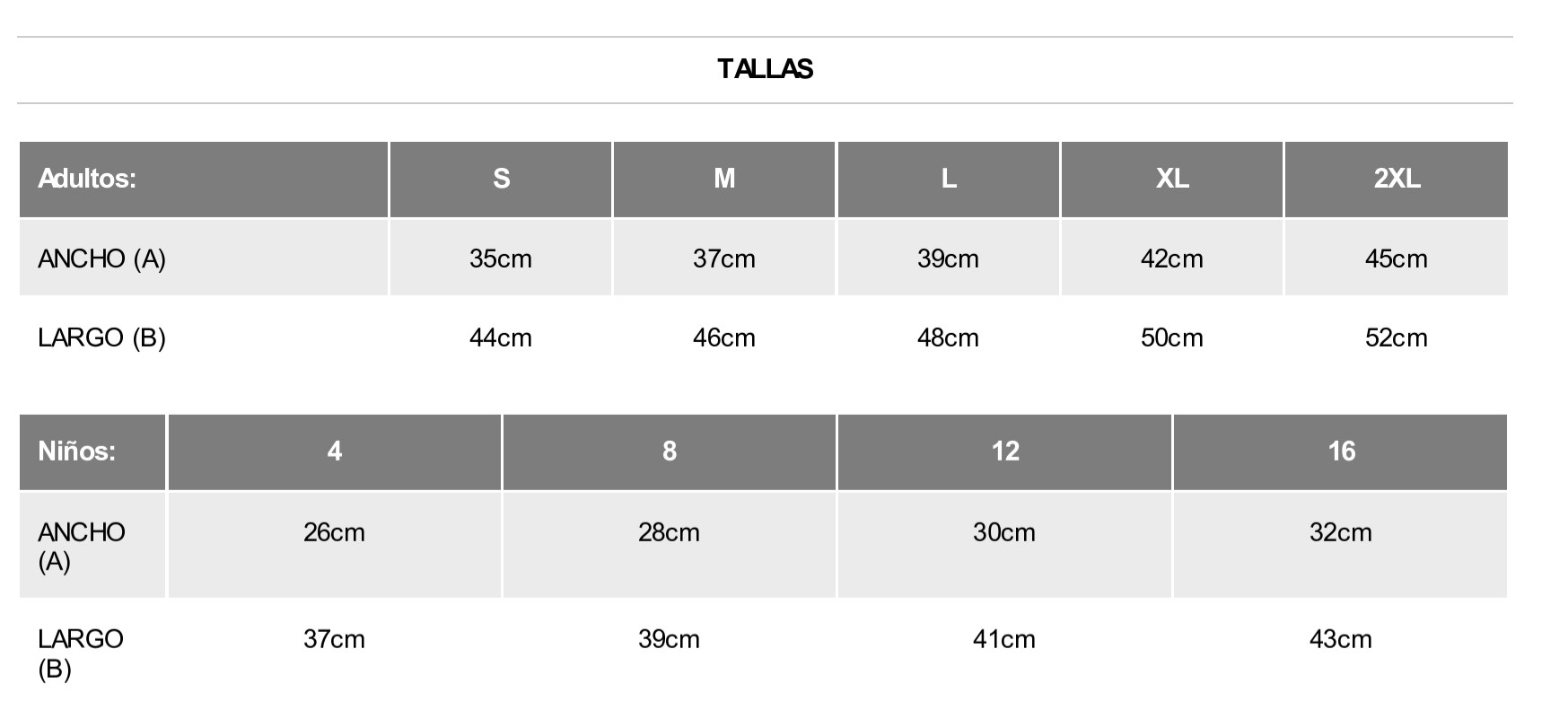 | Talla | 4 – 6XS, 8 – 4XS, 12 – 2XS, 16, S, M, L, XL, 2XL |